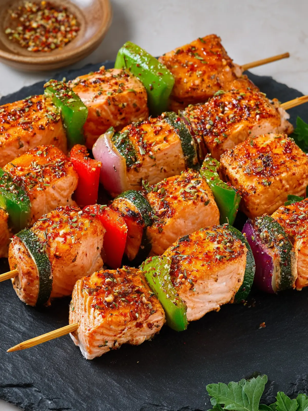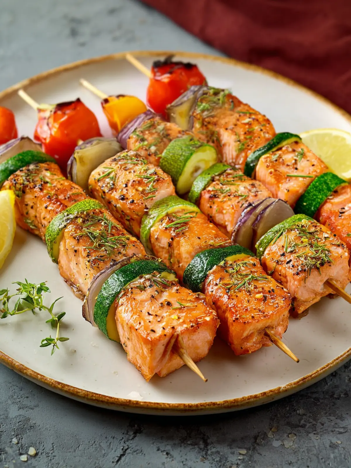 Delicious grilled salmon and vegetable skewers seasoned with olive oil and herbs.