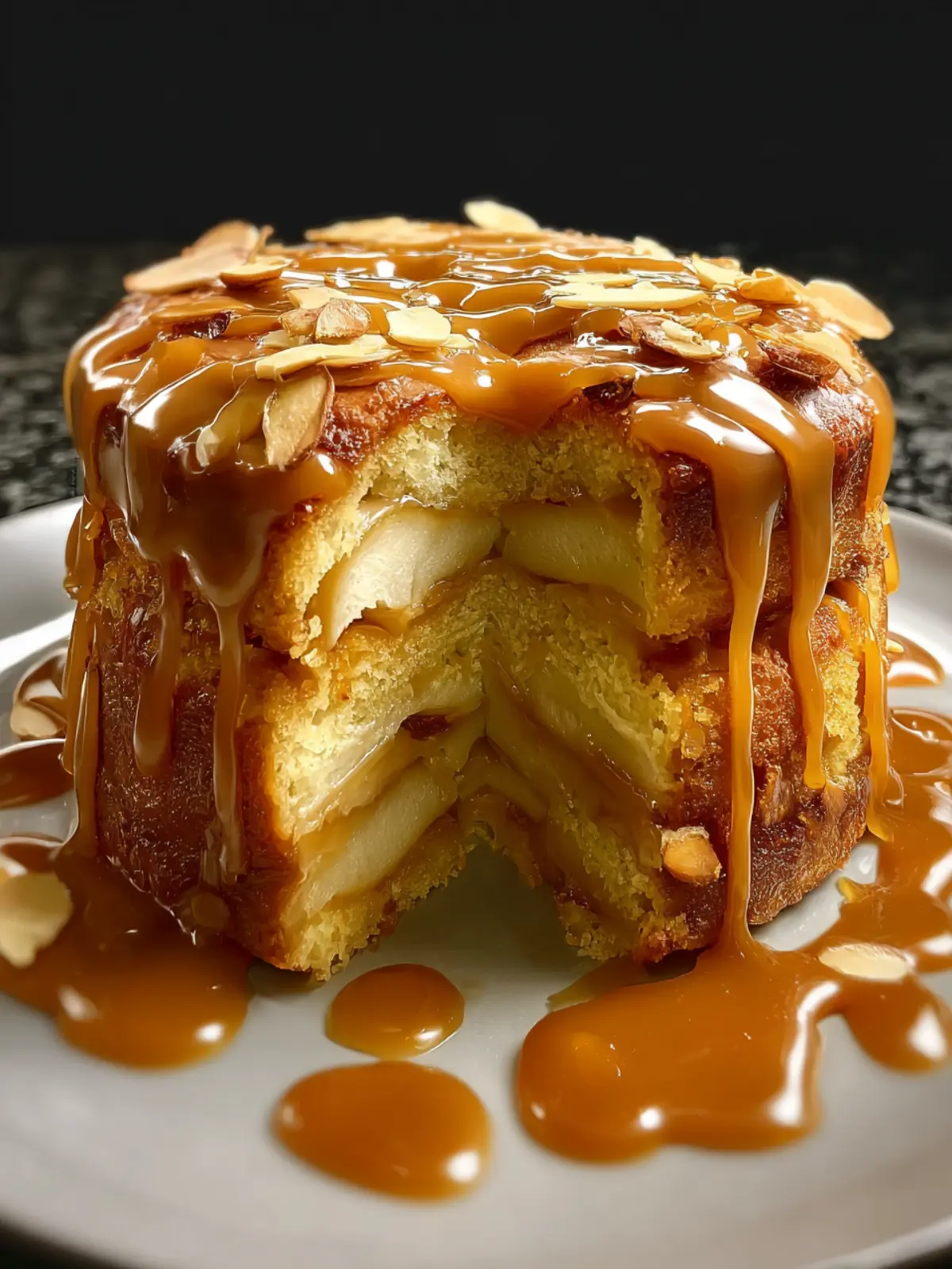 - Once the cake is completely cooled, drizzle the golden caramel over the top. Slice and serve the cake on a simple white plate, optionally garnished with extra slivered almonds or a sprinkle of sea salt.