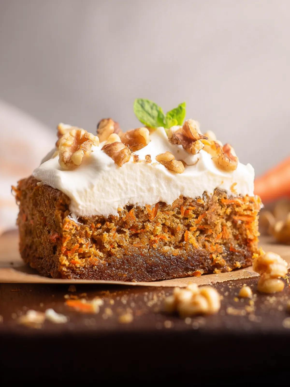 These moist and delicious carrot cake blondies are topped with a creamy frosting and crushed walnuts, perfect for any dessert lover.