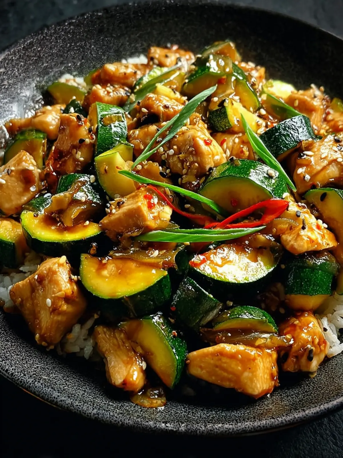 A quick and delicious stir-fry featuring chicken and zucchini, garnished with sesame seeds and green onions.