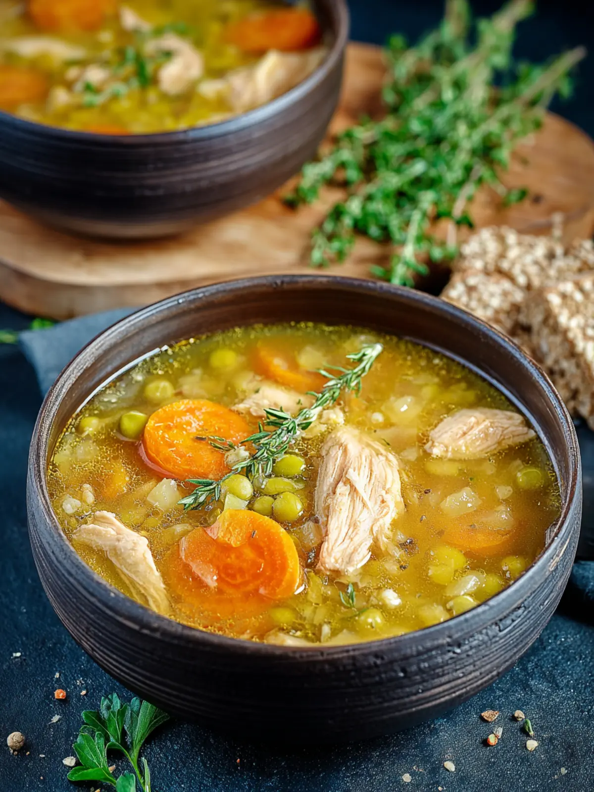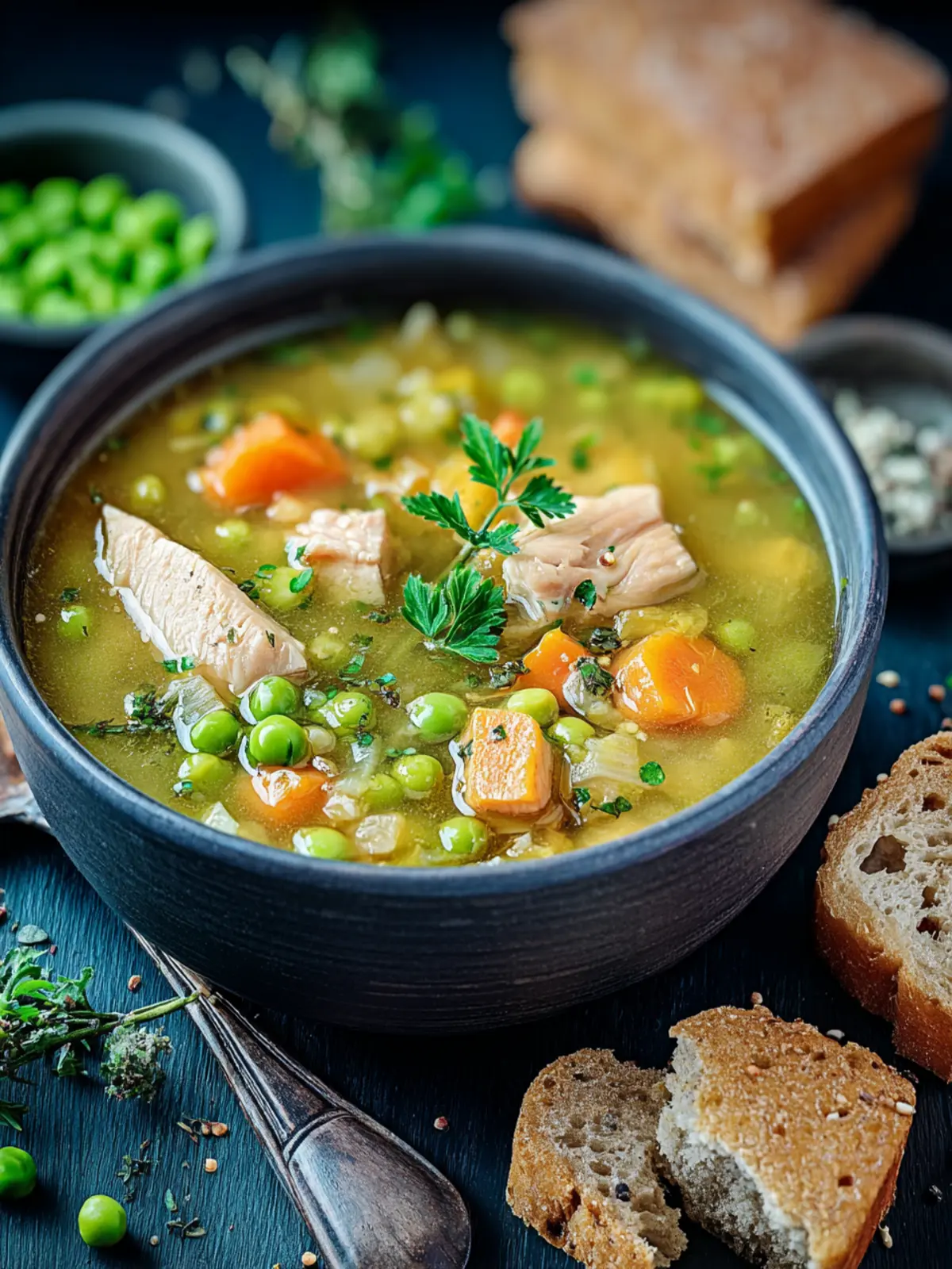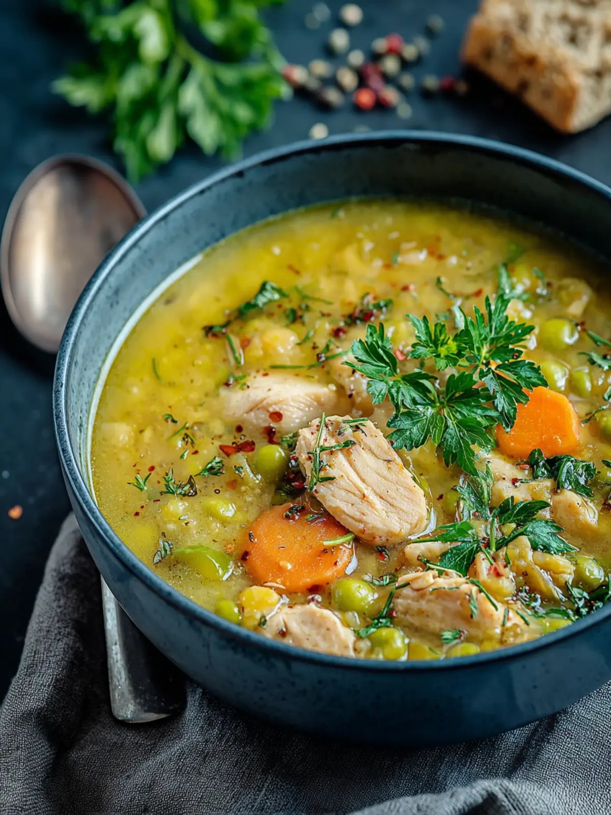 Seasoning is key in this cozy chicken split pea soup. A mix of thyme, bay leaves, and black pepper brings out robust flavors. Don’t hesitate to adjust these seasonings to suit your taste. This is your soup, after all!