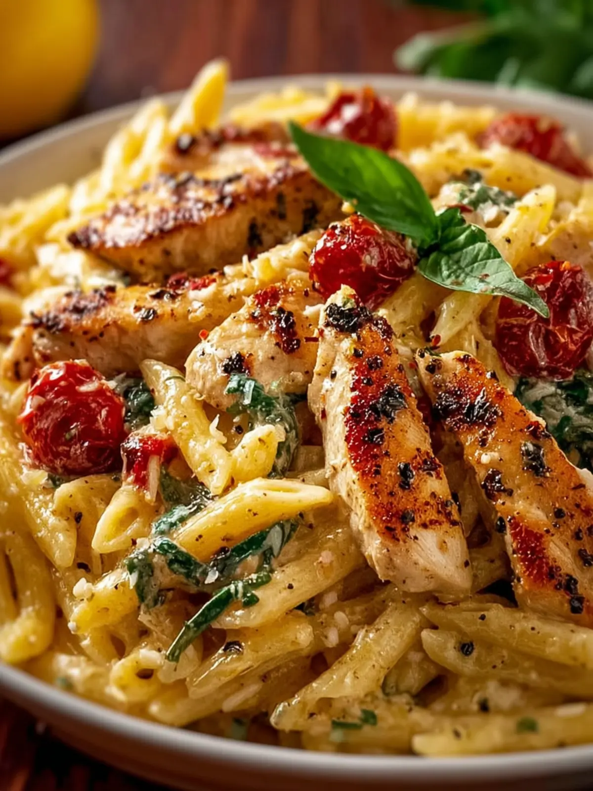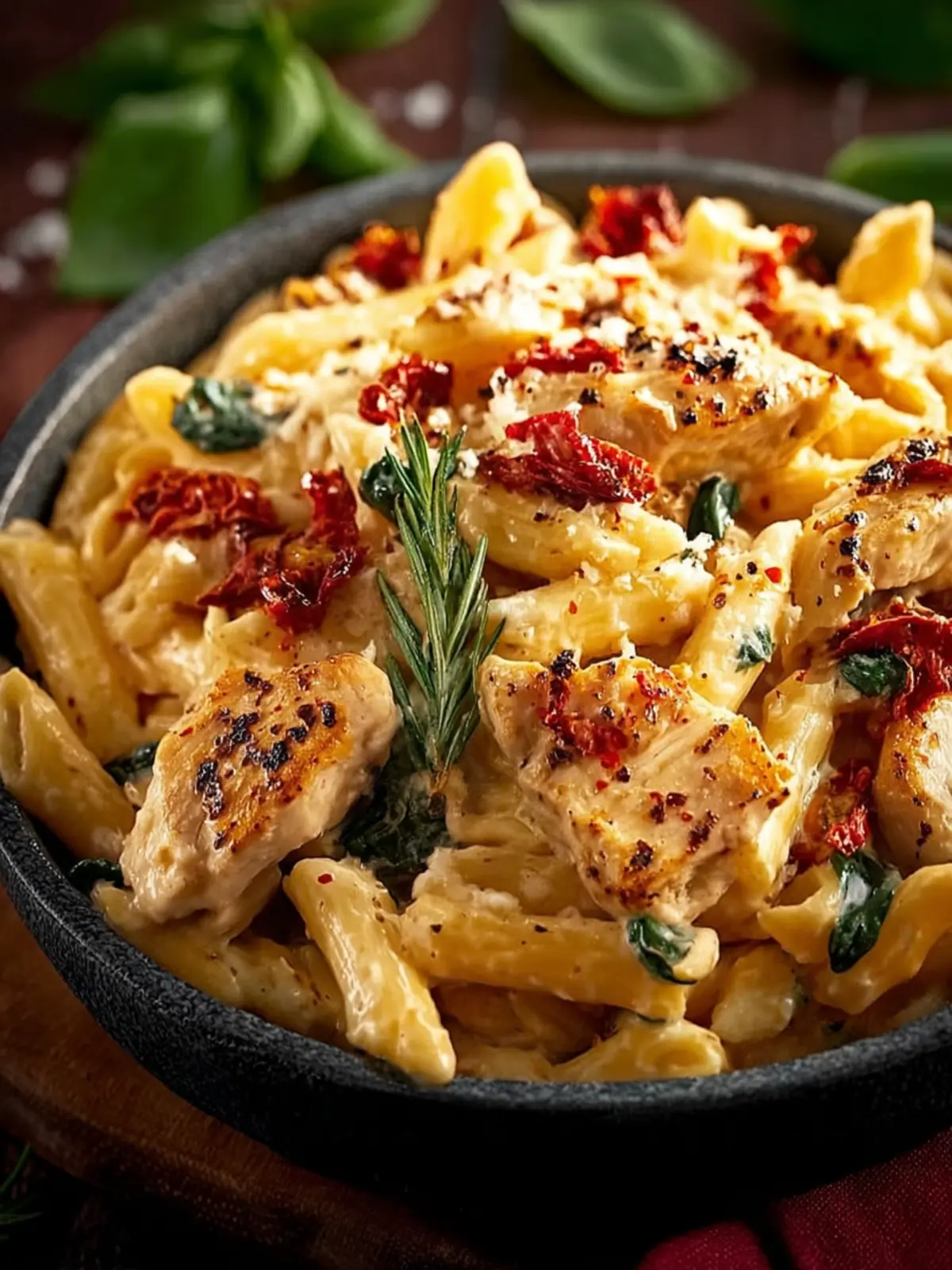 A delicious creamy pasta dish with chicken, sun-dried tomatoes, and spinach.