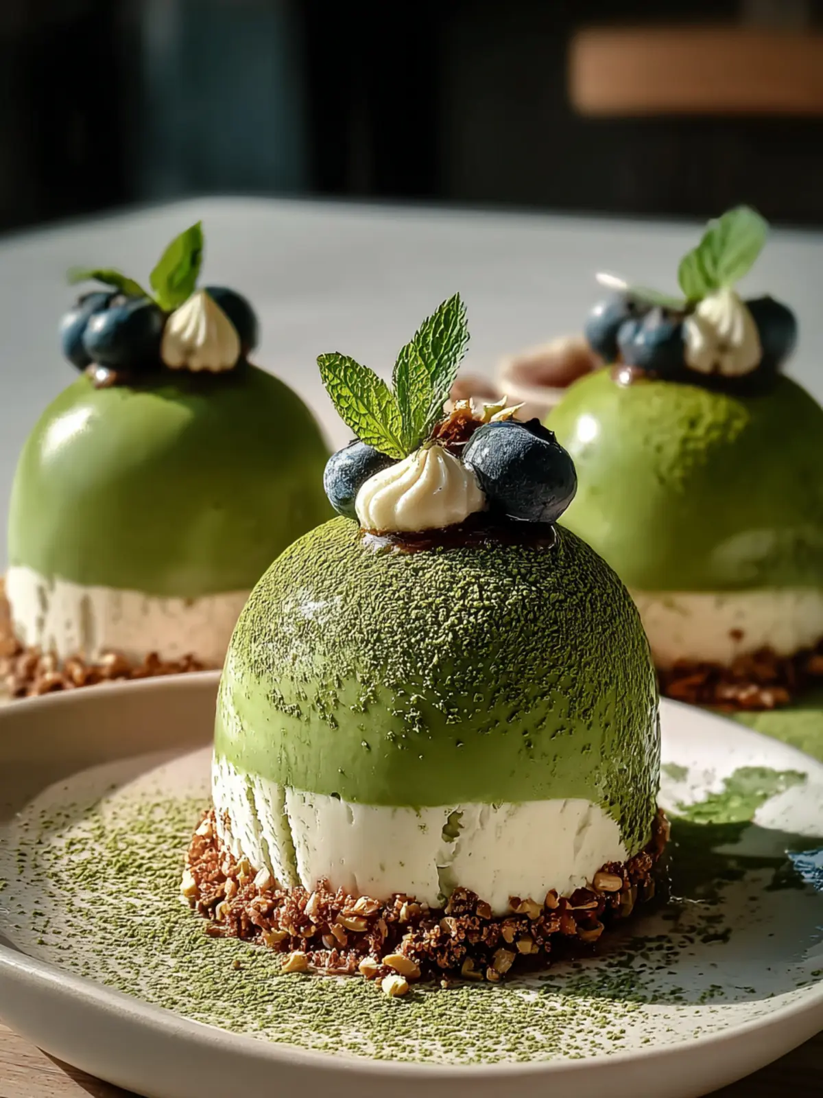 Presentation: Place each dome on a decorative plate or stand. You can garnish with fresh berries like raspberries or strawberries to create a vibrant contrast against the creamy, green mousse.
