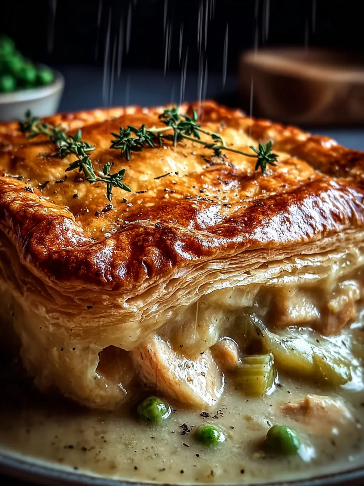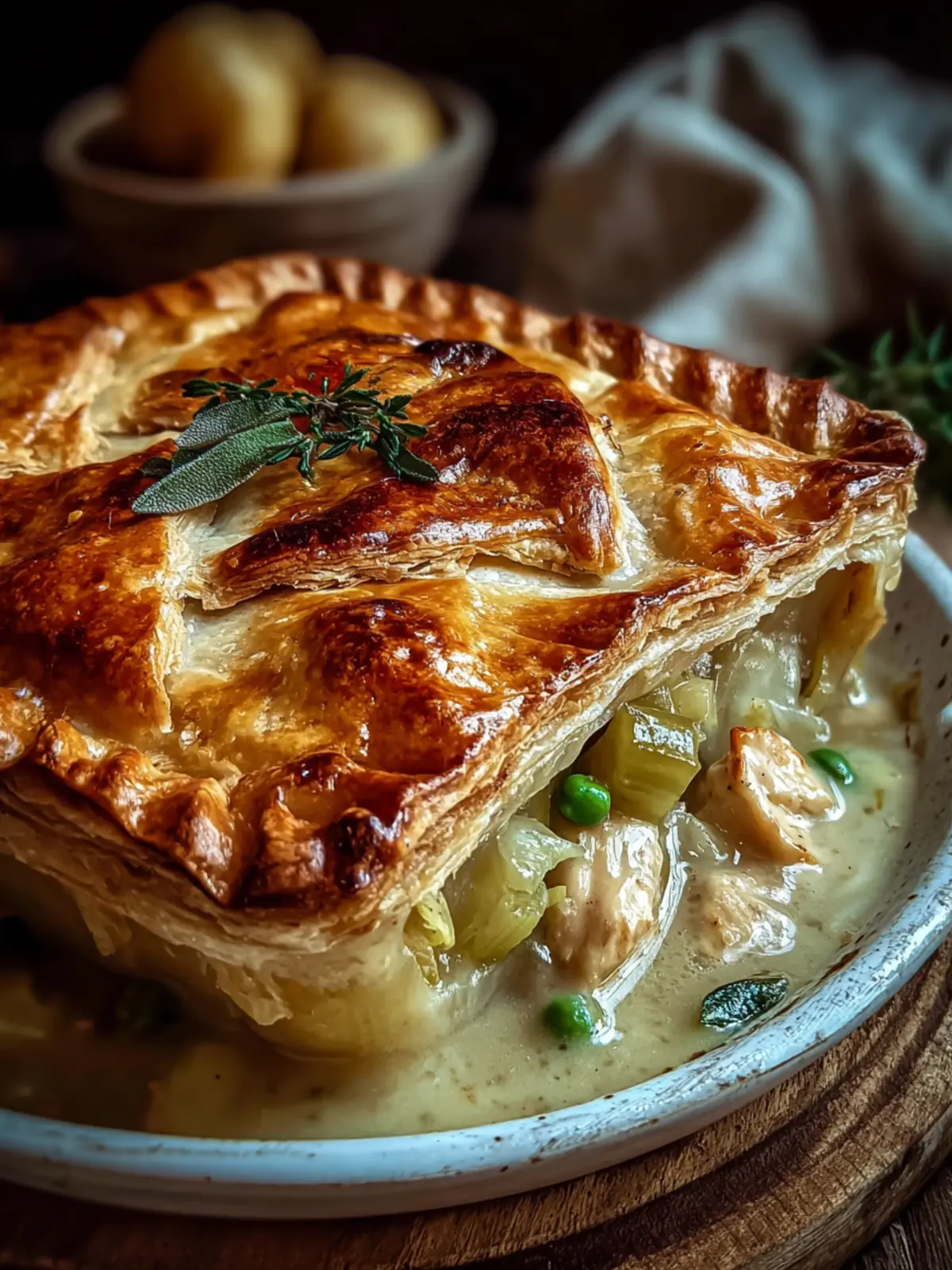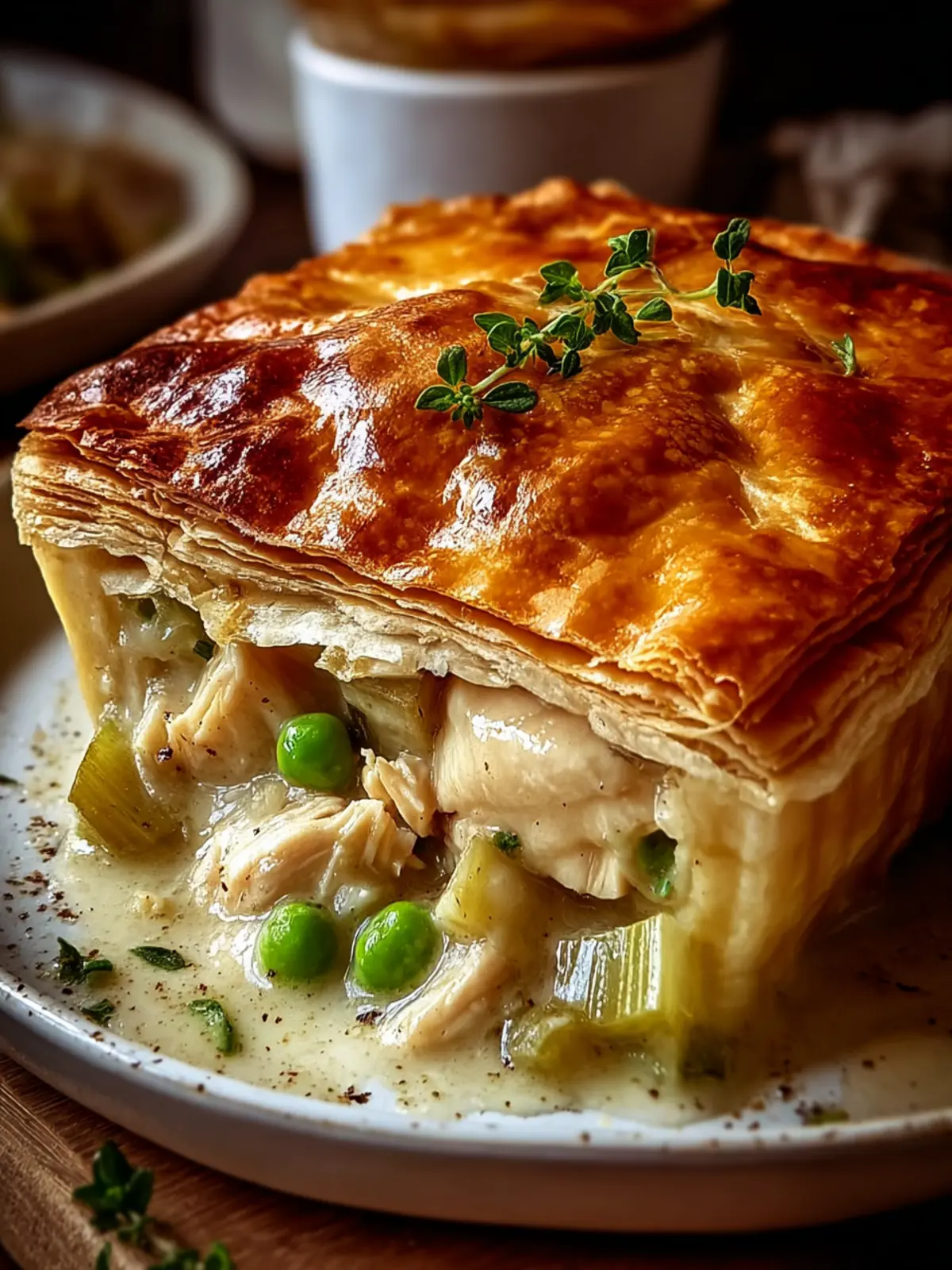 A delicious chicken pot pie made with tender chicken, leeks, and a creamy sauce, all encased in flaky puff pastry.