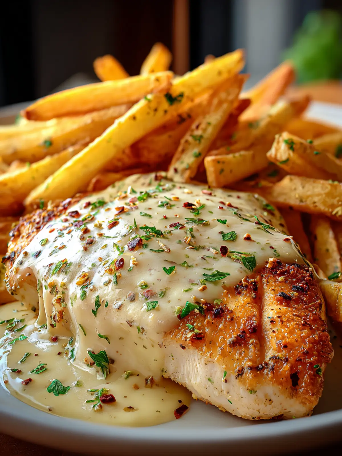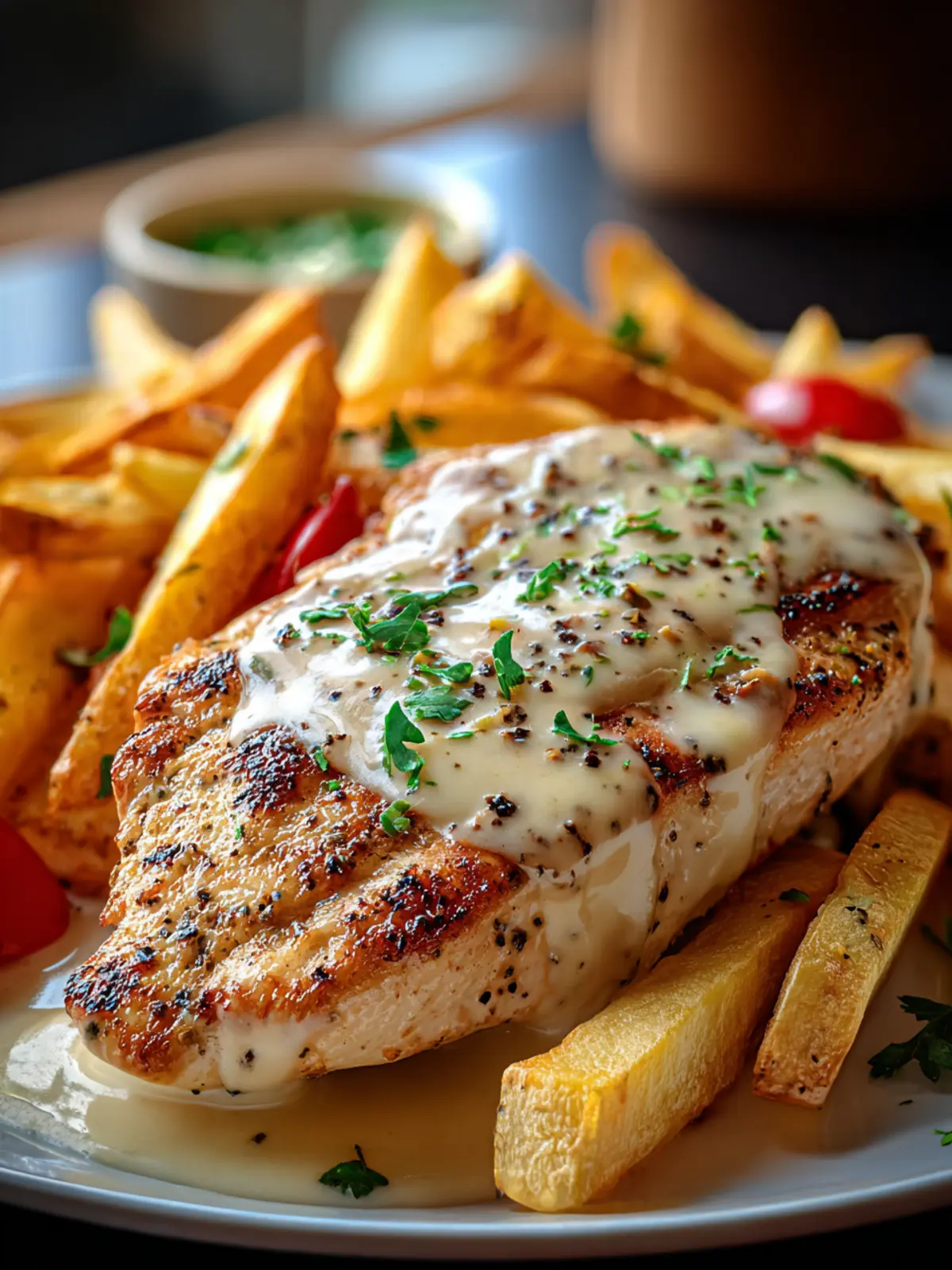 Irresistible Chicken Fillet with Garlic Parmesan Sauce & Crispy Fries