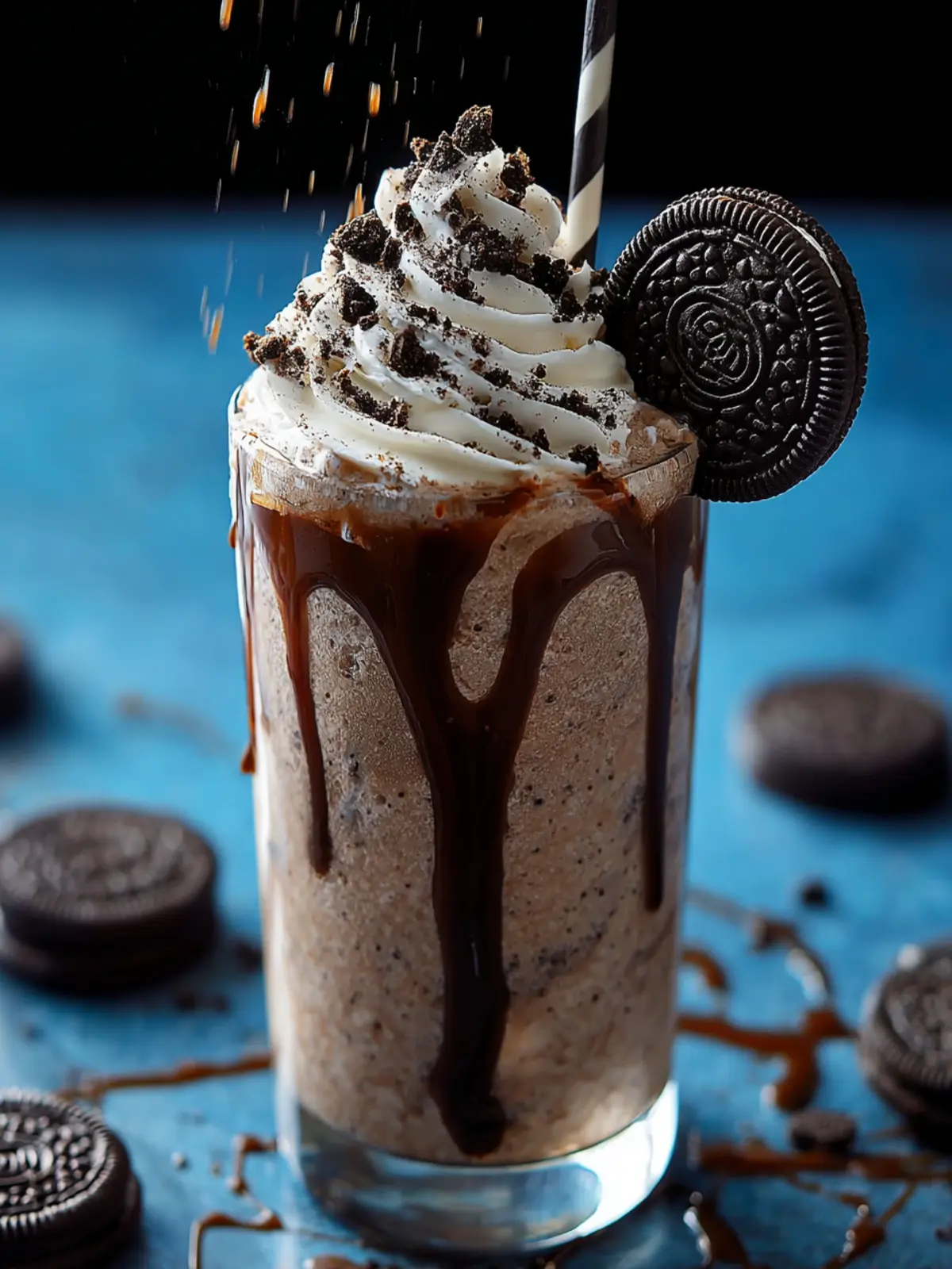 - Drizzle chocolate syrup inside each glass before pouring in the frappe mixture. Top generously with whipped cream and sprinkle crushed Oreos on top.