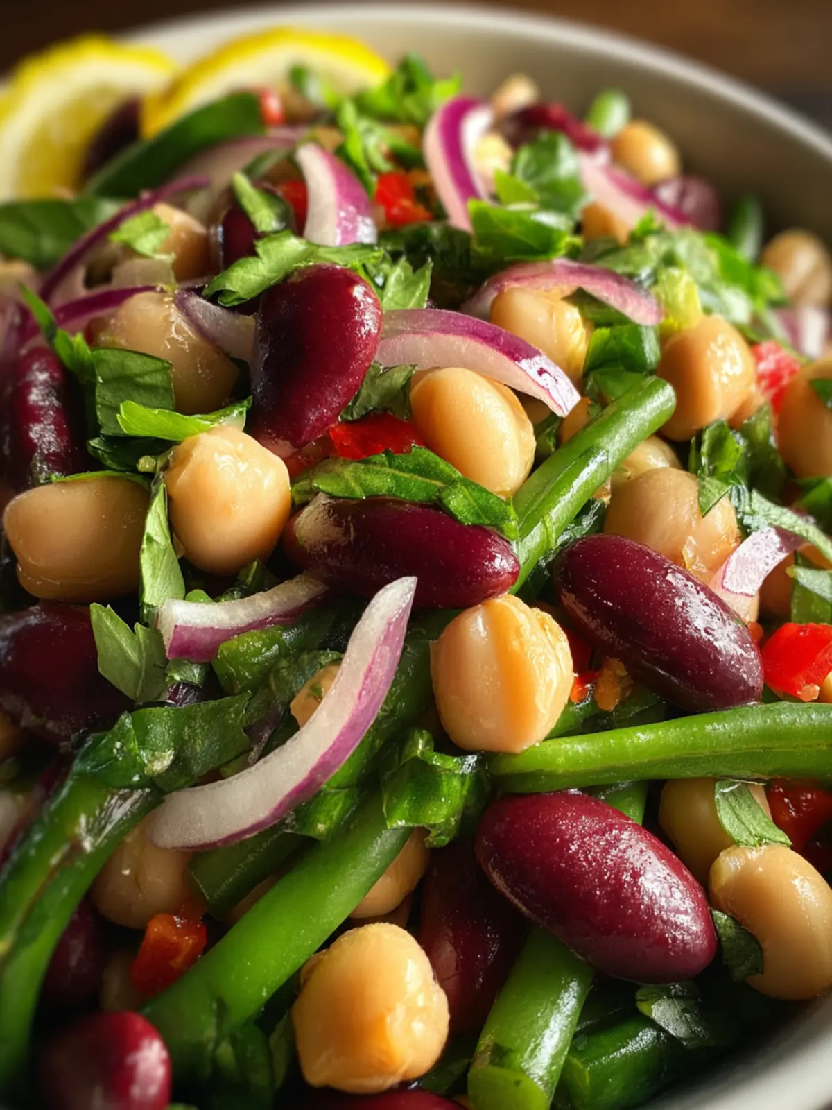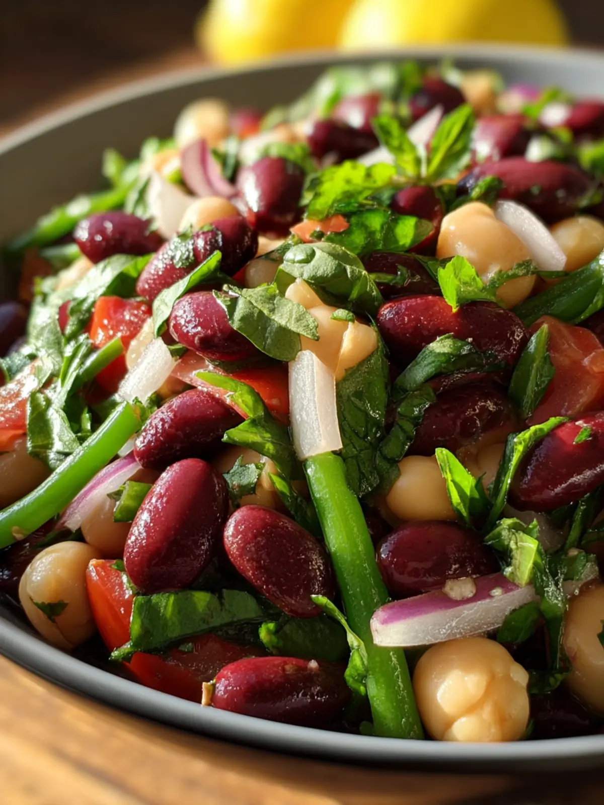 A refreshing salad with green beans, kidney beans, chickpeas, and a zesty dressing.