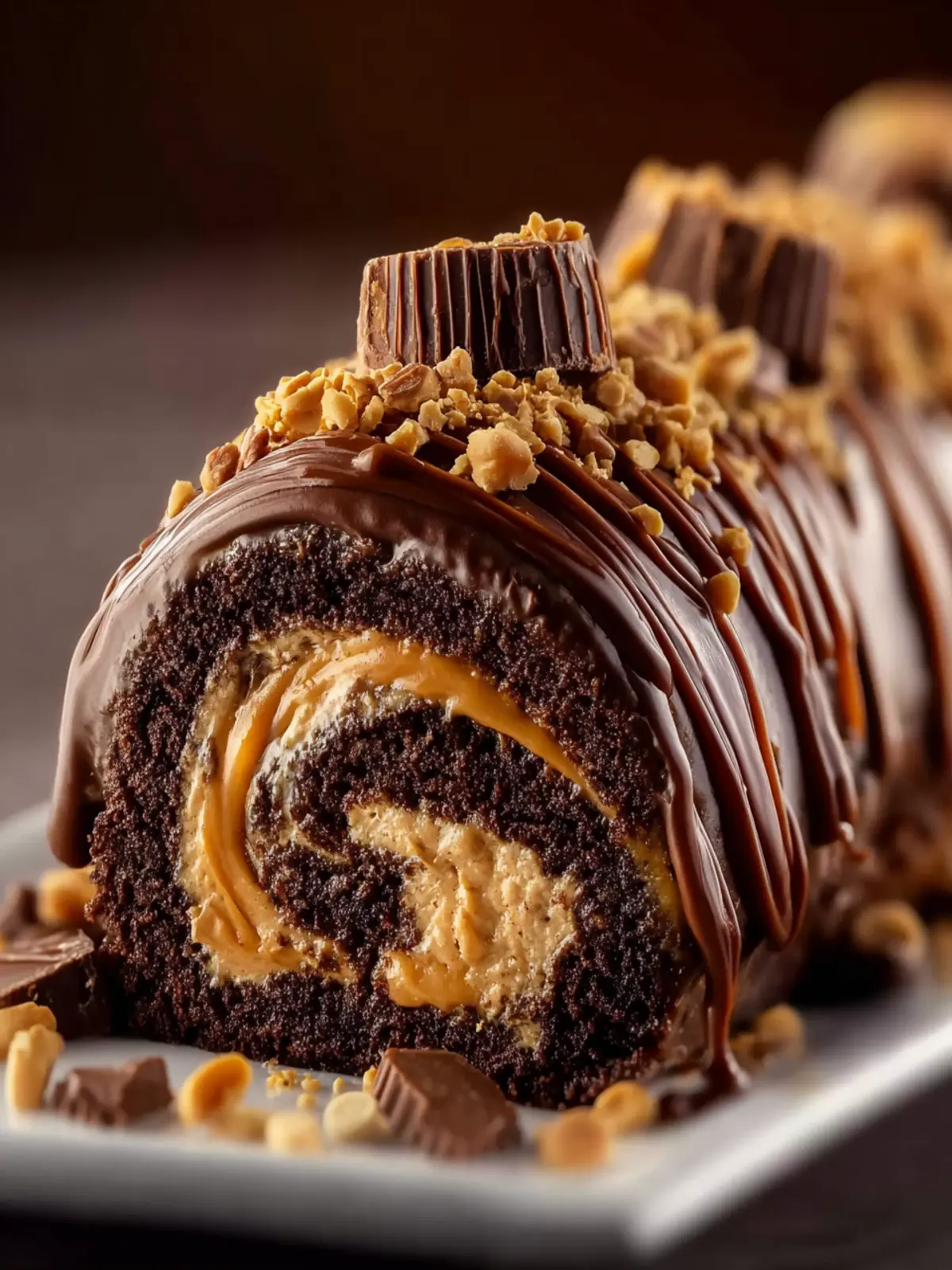 A delicious chocolate roll cake filled with creamy peanut butter and topped with a rich ganache.