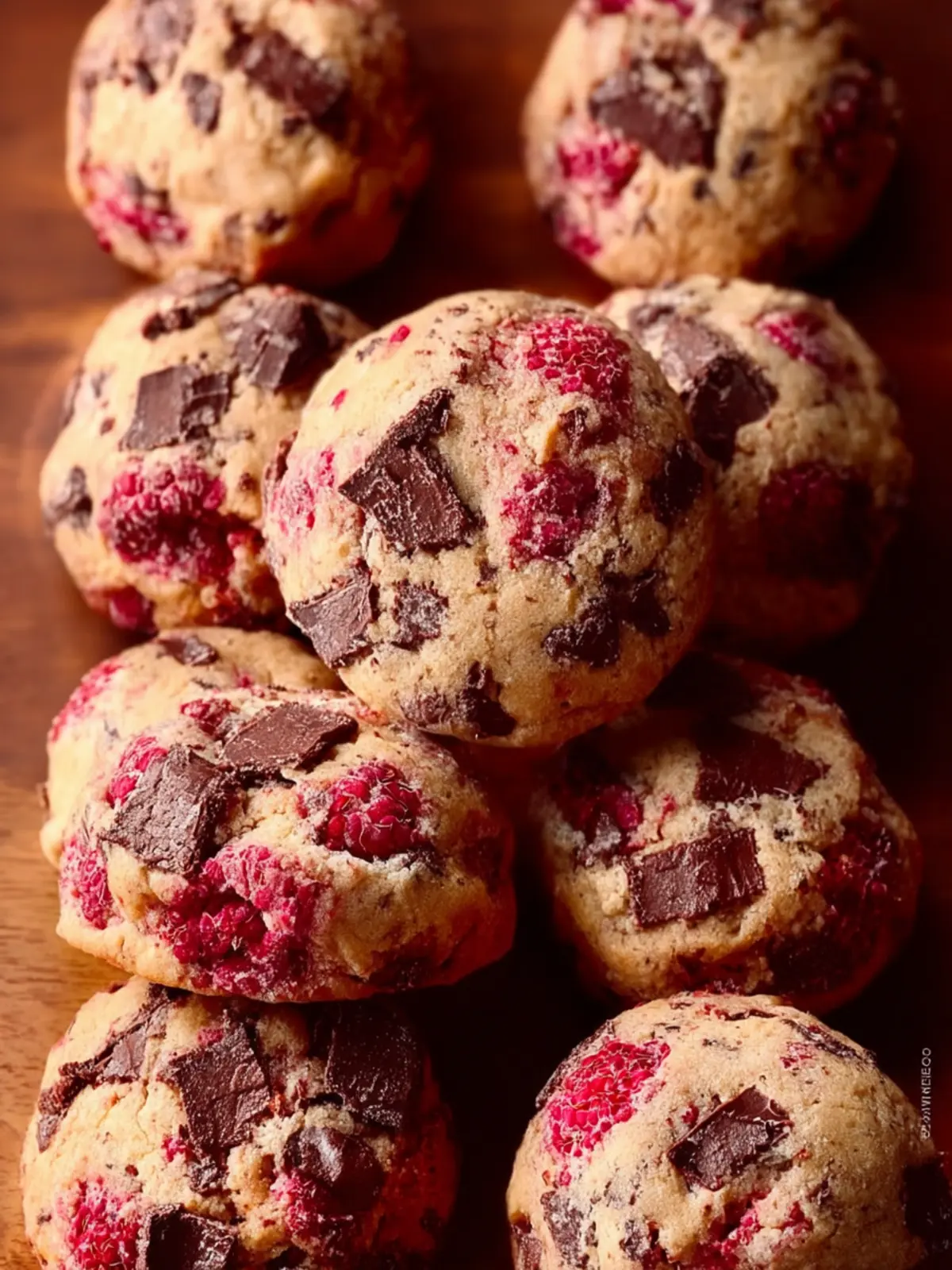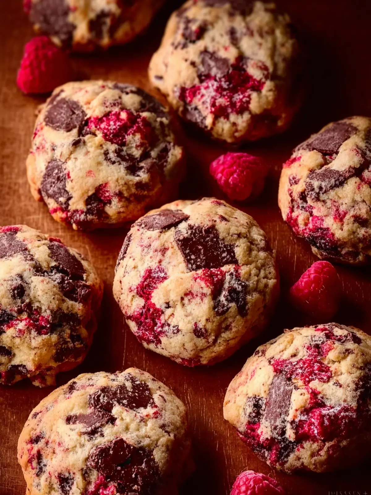 Delicious chocolate raspberry cookies that are soft, chewy, and bursting with fresh raspberries and dark chocolate chunks.