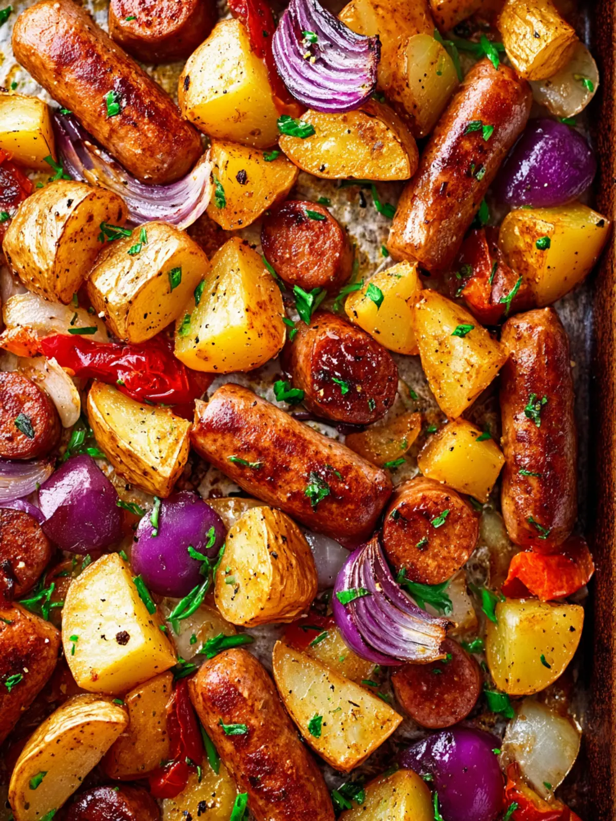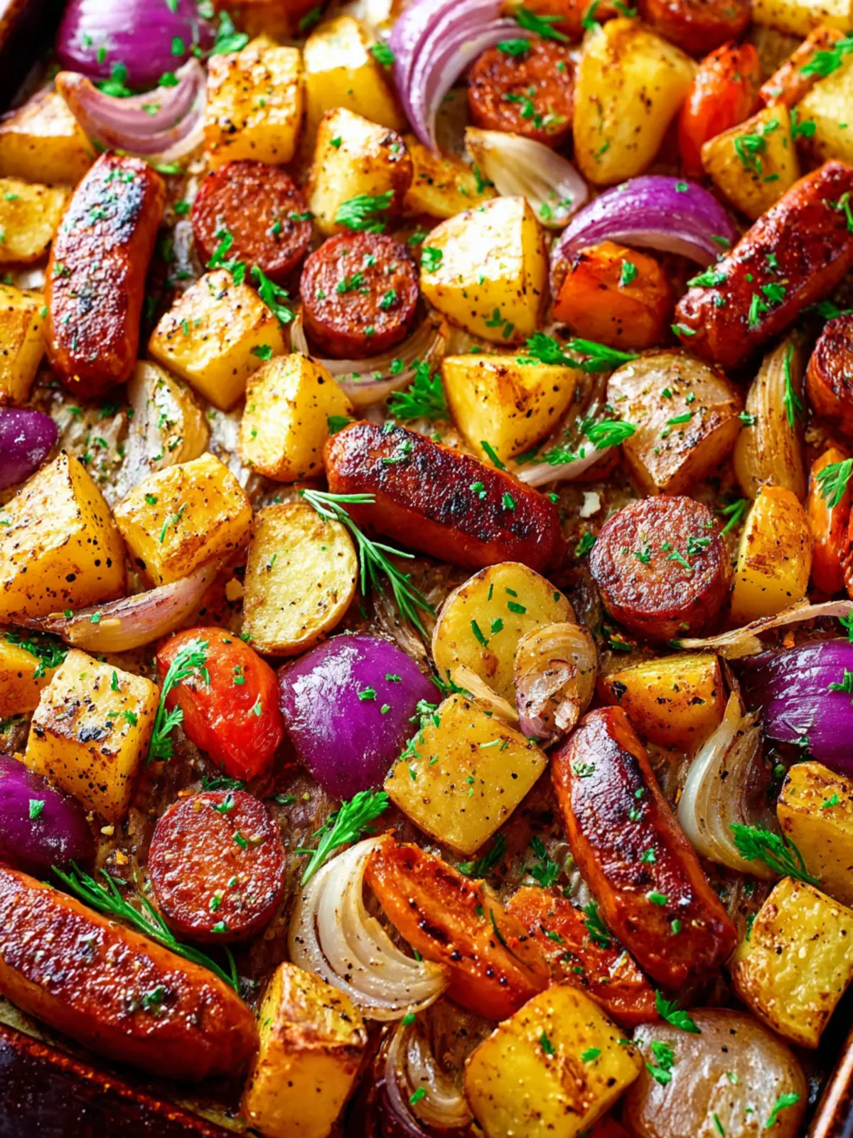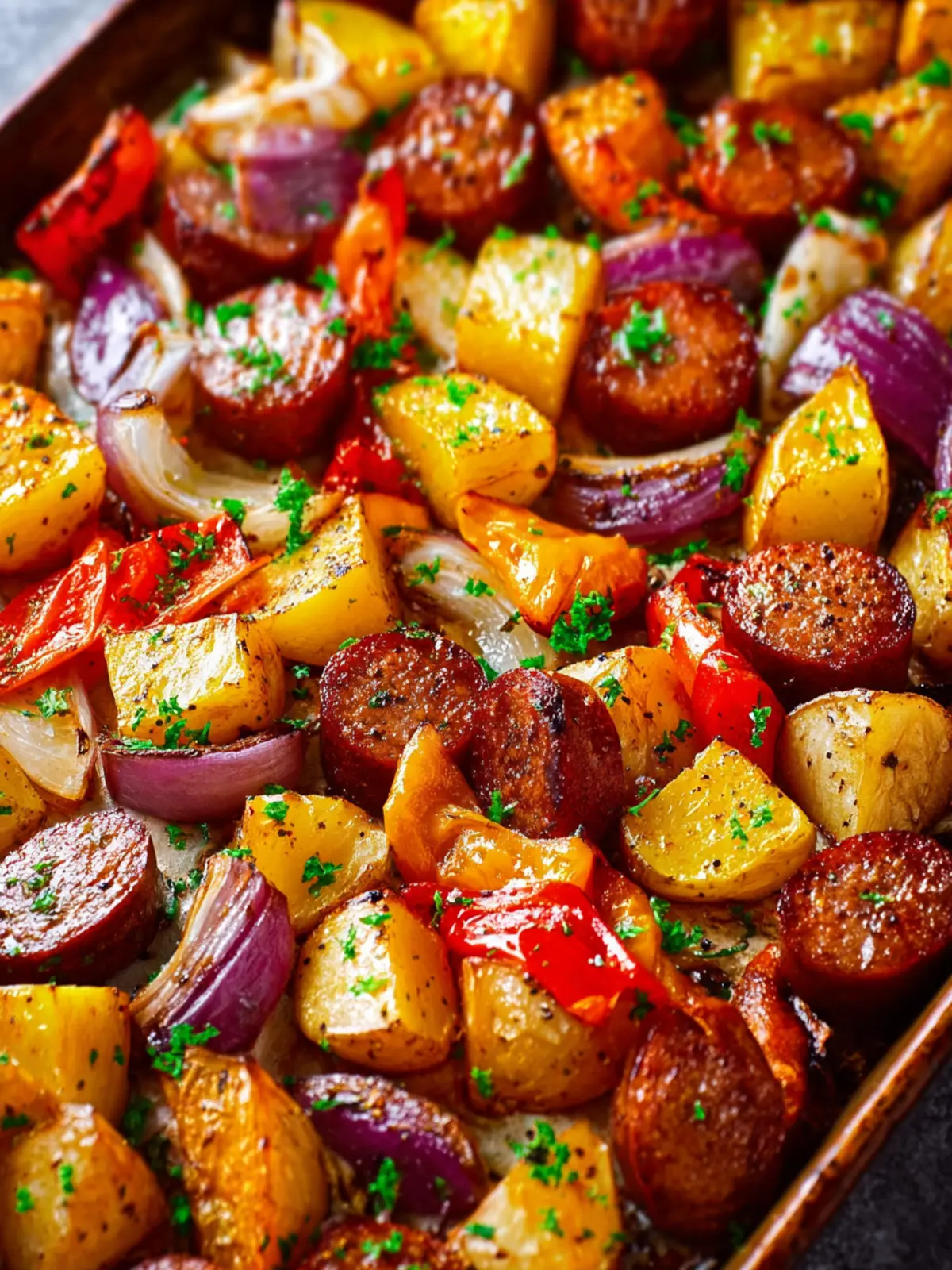A delicious and easy one-pan meal combining sausage, potatoes, and onions, baked to perfection.