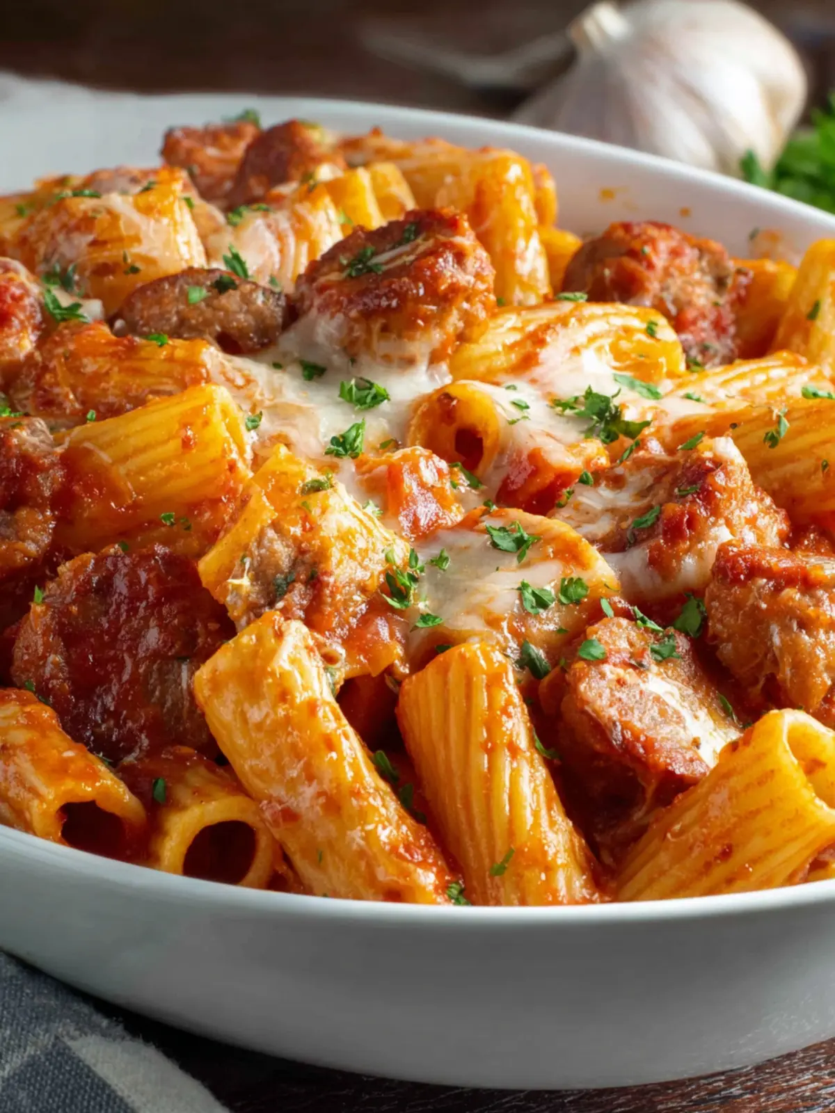 This delicious baked rigatoni is loaded with savory sausage, creamy cheeses, and a tasty marinara sauce.