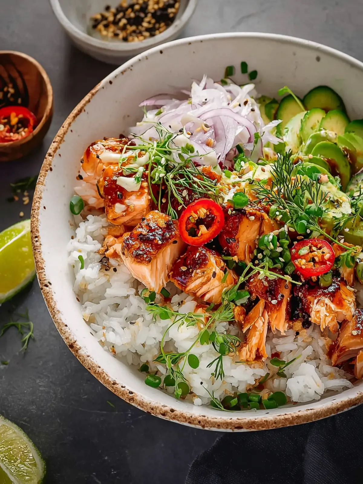 By combining these ingredients, you’ll create a dish that’s not just delicious but also nourishes your body and soul. Enjoy assembling your spicy salmon bowls with coconut rice and savor every mouthful!