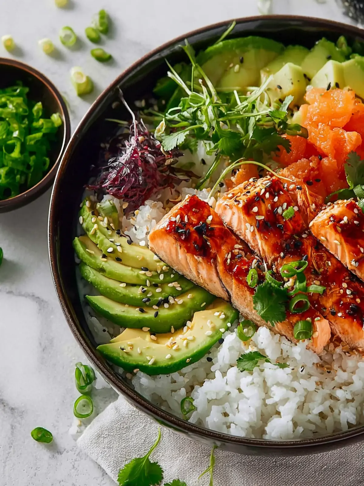 • Meal Prep Friendly: These bowls are perfect for meal prepping. Cook a big batch of rice and salmon at the beginning of the week, and you can mix and match different toppings for fresh, exciting meals each day.