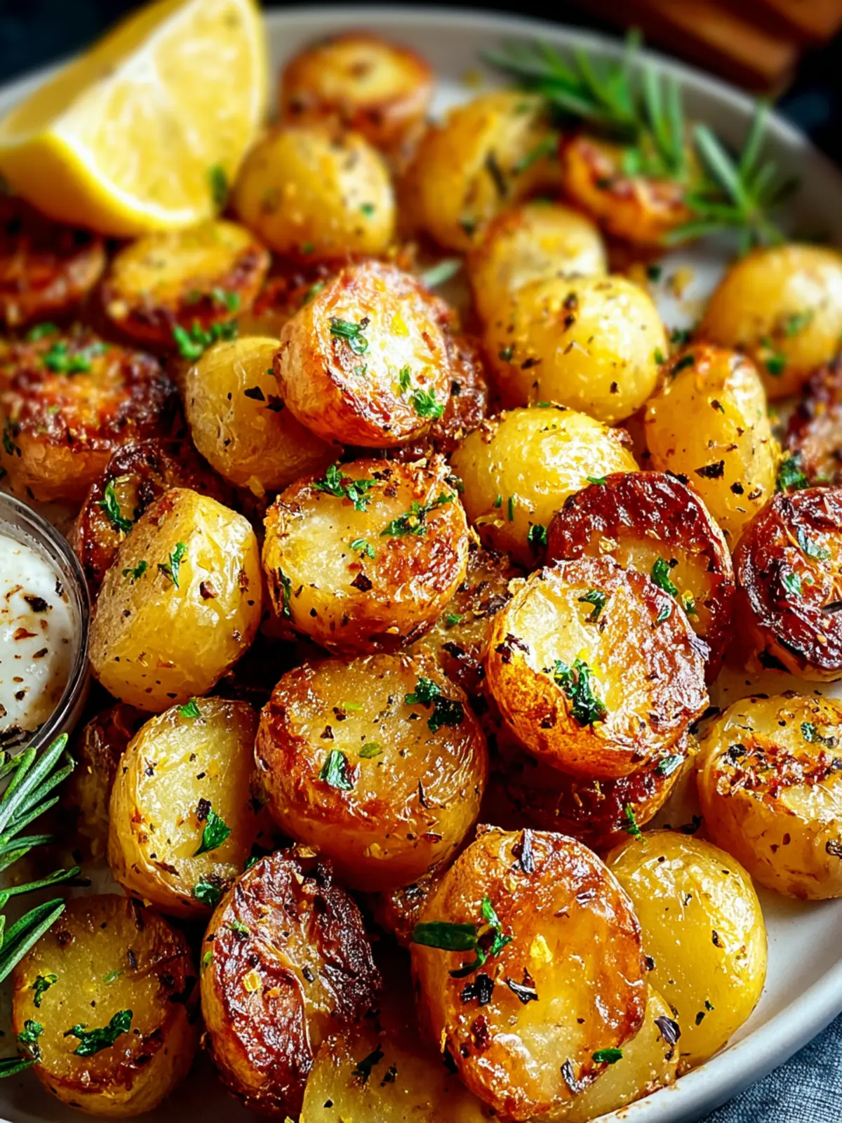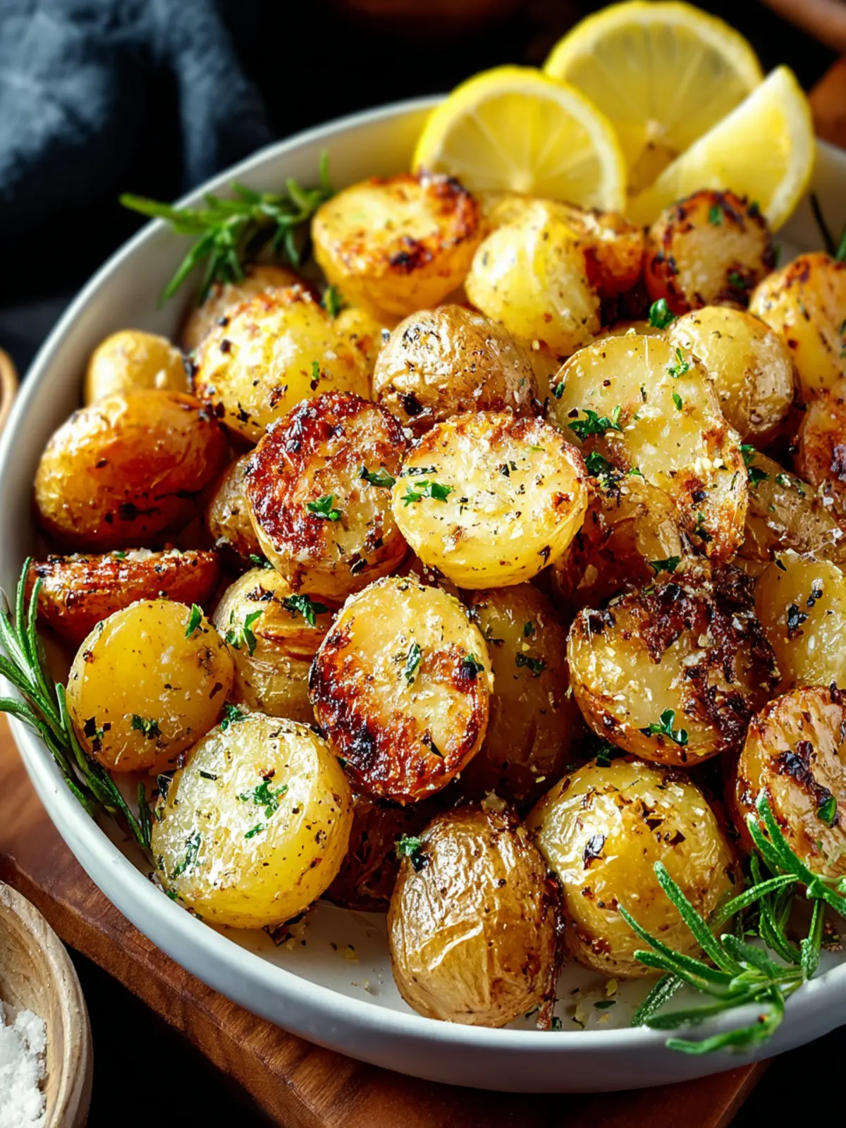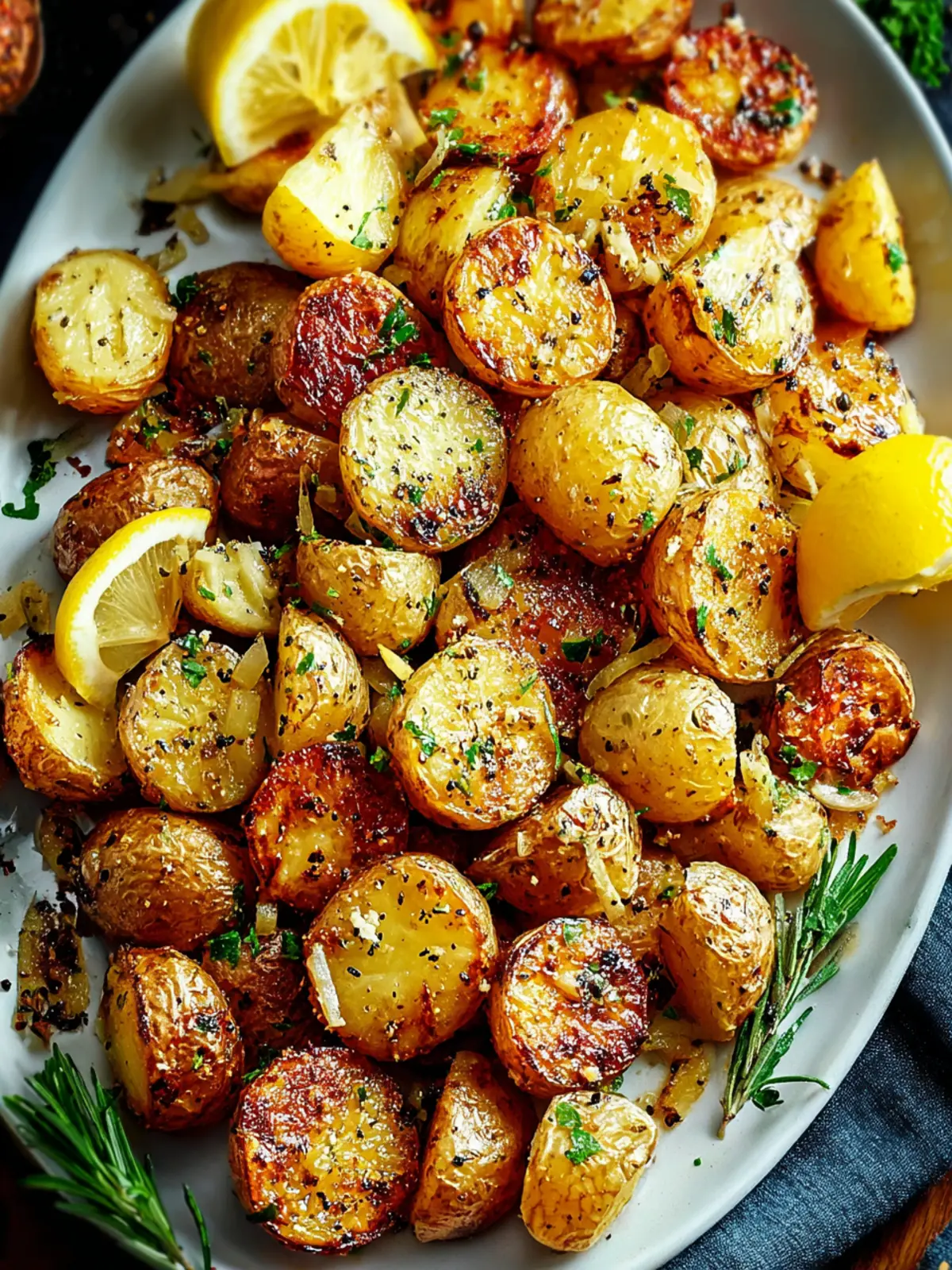 A delicious recipe for roasted baby potatoes seasoned with olive oil, lemon, garlic, and rosemary.